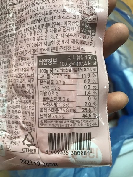 영양정보는 100g 당 칼로리 107kcal, 나트륨 338mg, 탄수화물 0.7g, 당류 0.2g, 지방 0.8g, 트랜스지방 0g, 포화지방 0.3g, 콜레스테롤 76.8mg, 단백질 24.5g 입니다. 150g 닭가슴살 제품이라 단백질은 36.7g으로 높은 단백질로 만족스러운 양입니다. 한 개만 섭취해도 넉넉한 단백질양이라 먹기 전 보기만 해도 근합성이 되는 기분입니다.