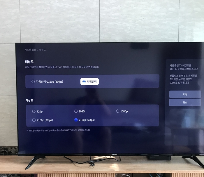 그리고 기가 지니 app 설정에서도 해상도를 변경해 줍니다. 보통 자동선택 2160p (30 fps)로 세팅되어 있습니다. 하지만 4k(60 fps)를 보기 위해 해상도를 변경해 줘야겠죠? 2160p (60 fps)로 변경 후 저장 하도록 합니다.