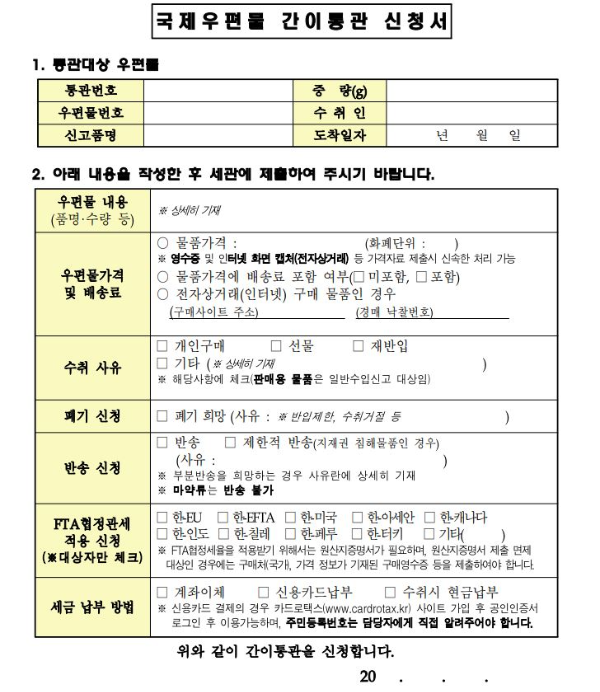 이럴 때는 따로 일반통관신청서를 작성하여 통관 신청을 하거나 관세사를 통해서 해야 한다.