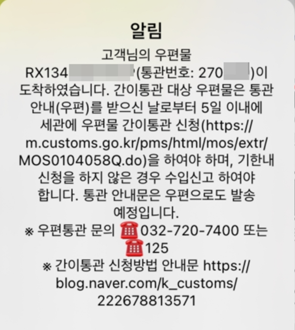 오늘 국제우편물 간이 통관을 신청하라고 우체국에서 문자가 왔다.