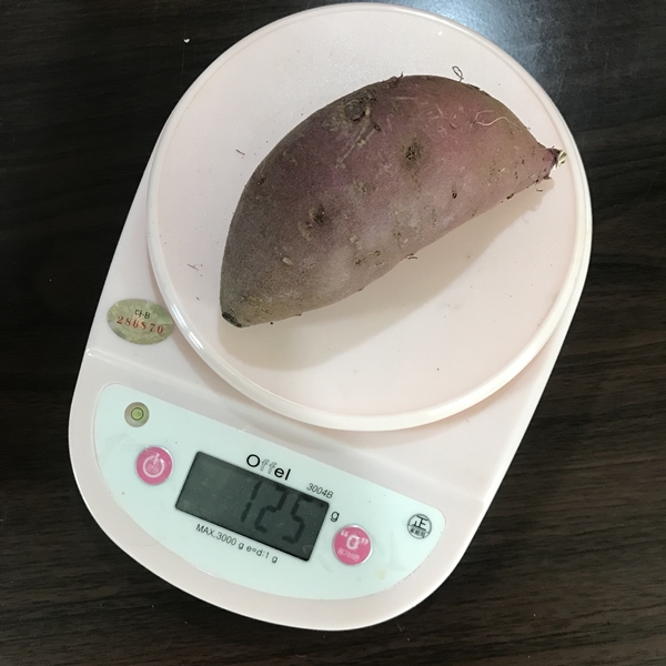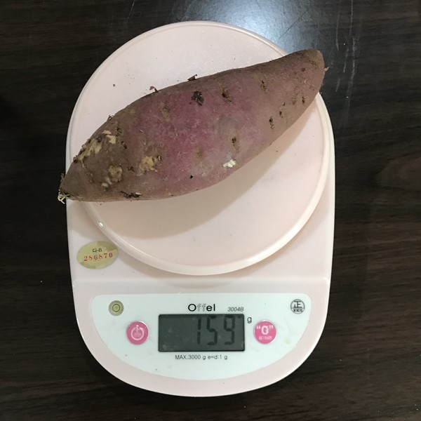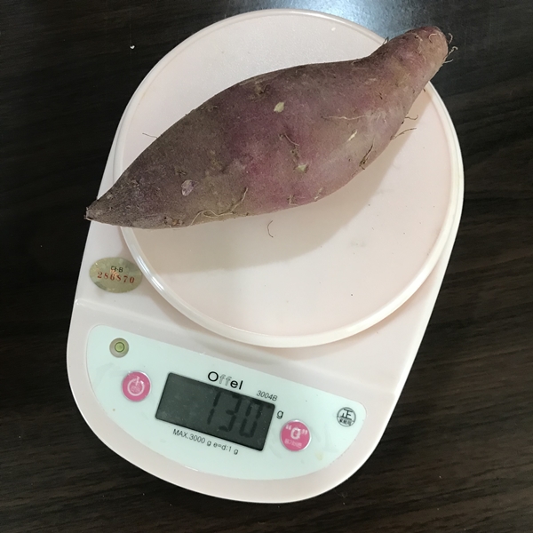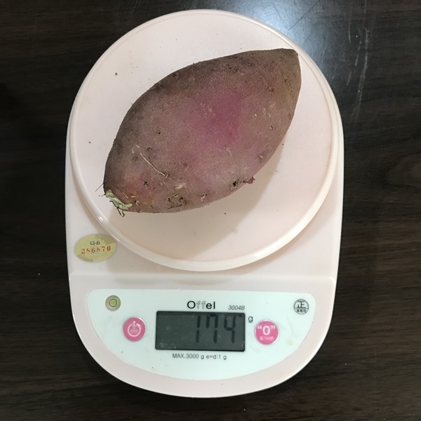 무게를 직접 저울로 측정해보니 김의준 고구마의 특상 크기의 무게는 평균 186g이었습니다. 200g이 넘는 고구마도 있고 사이즈와 무게 편 차가 심하기 때문에 다이어트 식단을 구성하시는 분들께는 추천하는 고구마 사이즈가 아닙니다.