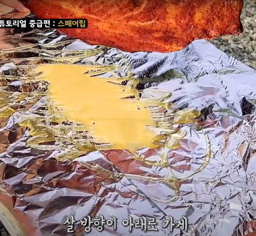 총 3시간째 되었을 때 알루미늄 호일로 살 방향이 아래로 가게 랩핑을 해줘야 합니다. 이때 알루미늄 호일 위에 설탕과 꿀을 과하다 싶을 정도로 많이 뿌린 후 그 위에 사과주스나 물을 적당히 뿌린 후 등갈비 살 방향이 아래로 가게 올려 줍니다. 알루미늄 호일이 찢어지지 않게 두 겹씩 겹쳐서 공기가 세지 않게 싸준 후 다시 2시간 더 바베큐 그릴에 넣어 줍니다. 바베큐 그릴은 차콜 브리켓을 처음 넣었을 때 3시간 정도 지나면 온도가 떨어지는 경우가 많습니다. 저도 온도가 떨어지는 걸 방지하기 위해 차콜 브리켓을 4개 정도 추가로 넣어 줬습니다.