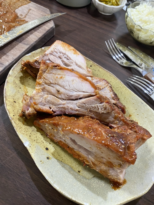 위 사진이 등갈비 바베큐를 호일에 싸서 2시간 더 쪄준뒤 오픈한 모습입니다. 총 5시간 바베큐 그릴에 있었으며 등갈비를 손으로 들면 등갈비 살이 뼈에서 떨어질 정도로 부드러운 게 느껴집니다. 이제 등갈비에 바베큐 소스를 적당히 바릅니다.