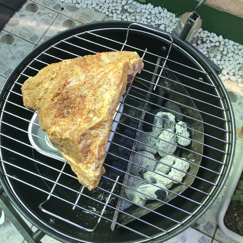 등갈비나 스페어립으로 바베큐를 할 때 바베큐 그릴의 온도는 120도에서 135도 사이로 세팅해줍니다. 밑에 은색 알루미늄 직화 용기에 뜨거운 물을 가득 채워 줬습니다. 뜨거운 물을 가득 채워주면 내부에 수분이 유지가 되어 등갈비가 뻑뻑해지는 것을 막아주고 바베큐 온도를 유지하는데 큰 도움을 줍니다. 차콜 브리켓은 웨버 제품을 사용하였으며 한쪽에 10개 정도를 불을 지펴서 넣어주고 반대쪽에 4개 정도 불을 붙이지 않은 차콜 브리켓을 넣어 줍니다. 차콜 브리켓의 개수는 날씨나 주변의 환경에 따라서 차이가 있는 점 참조 부탁드립니다. 럽을 잘 바른 한돈 등갈비를 바베큐 그릴 위에 올려 준 후 사과주스나 물을 스프레이로 고기에 적당히 뿌려 줍니다. 사과주스나 물은 1시간마다 한 번씩 등갈비 위에 적당히 뿌려 줬습니다.