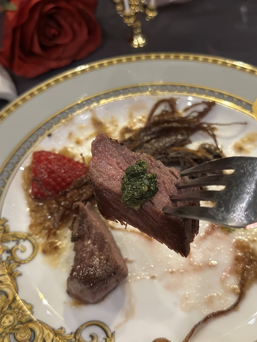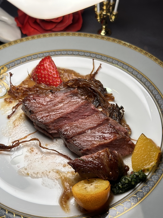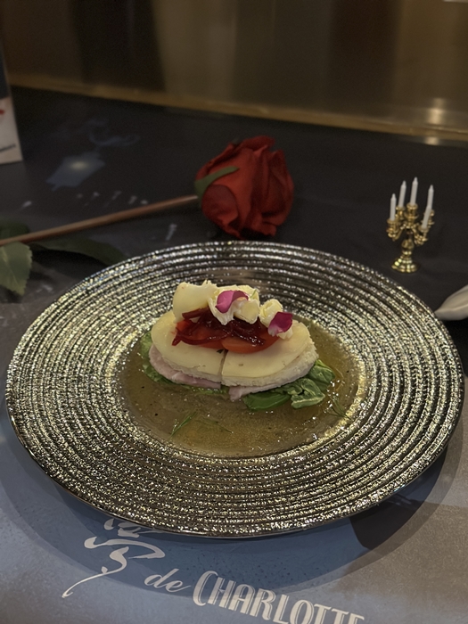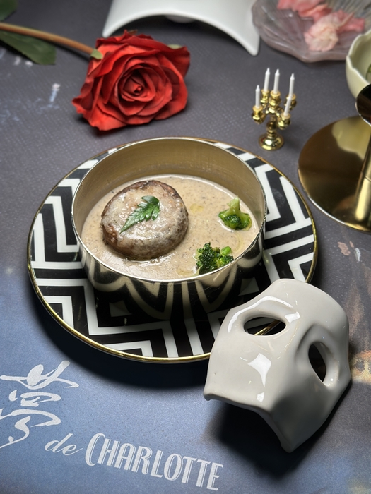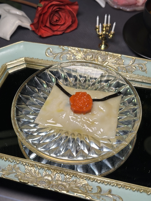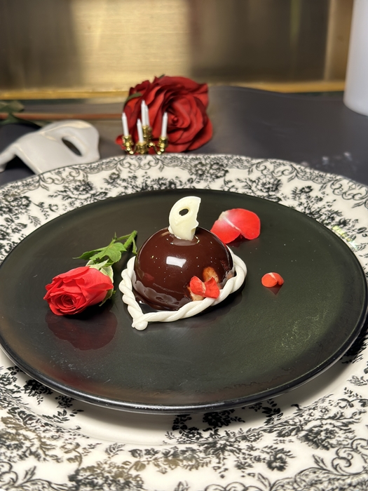 소고기 양송이버섯 덮개 위에는 생화 장미가 올라가 있습니다. 크리스틴을 향한 유령과 라울의 마음을 표현한 것일까요?