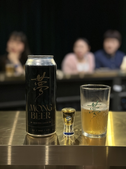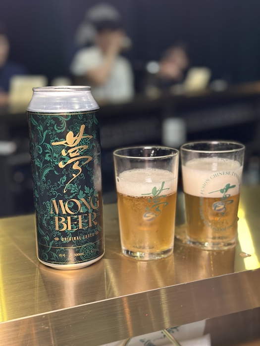 소고기 양송이버섯 팍시와 몽자단입니다. 몽자단은 몽비어와 샷잔에 고량주를 담아서 맥주에 투하하여 먹는 고백입니다.
