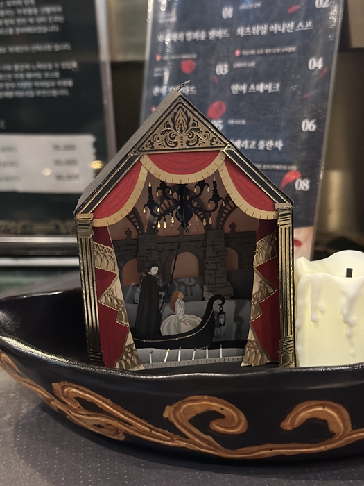 오페라의 유령을 대표하는 오브제 2개가 준비되어 있습니다. 바로 너무나도 유명한 에릭의 가면과, 오페라의 유령인 에릭이 크리스틴을 납치하여 오페라 극장 지하 호수에서 이동하는 모습을 담은 오브제입니다. 오페라 지하 호수 수면에 반사되어 반짝이는 촛불과 유령이 부르는 밤의 노래는 가슴 한편을 아련하게 만듭니다.