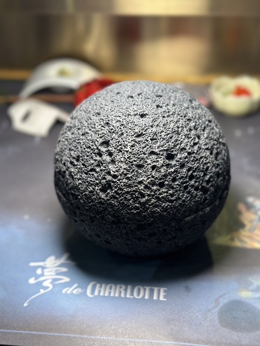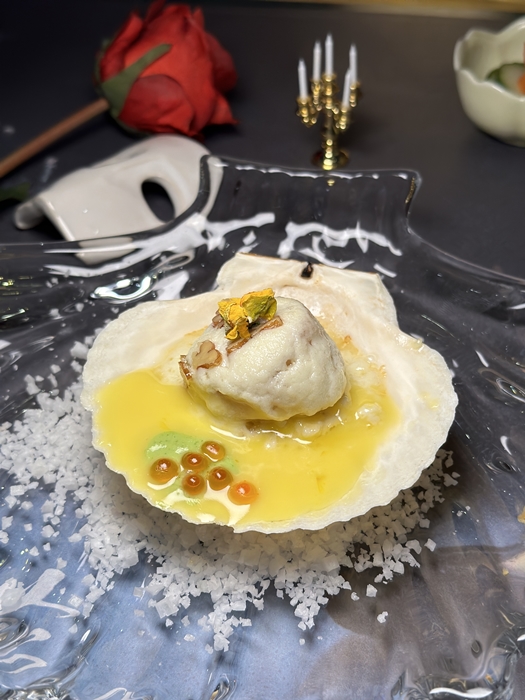 네 번째 메뉴는 연어 스테이크입니다. 드라이아이스 위에 세팅된 연어 스테이크 퍼포먼스는 한 번 더 오페라 극장 지하 호수를 떠오르게 합니다. 스토리 텔링과 함께 하는 식사가 이렇게 즐거울 줄 몰랐습니다.