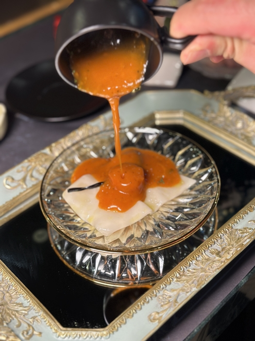 두 번째 메뉴는 치즈 튀일 어니언 수프입니다. 바삭한 치즈 튀일과 부드러운 식감의 양파의 조화가 좋은 메뉴입니다. 페어링 와인은 미오네토 프로 세코 로제 스파클링입니다. 살짝 느끼할 수도 있는 수프의 맛을 균형 있게 잘 잡아주는 와인 페어링이었습니다.