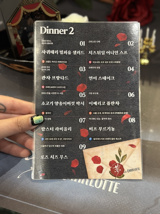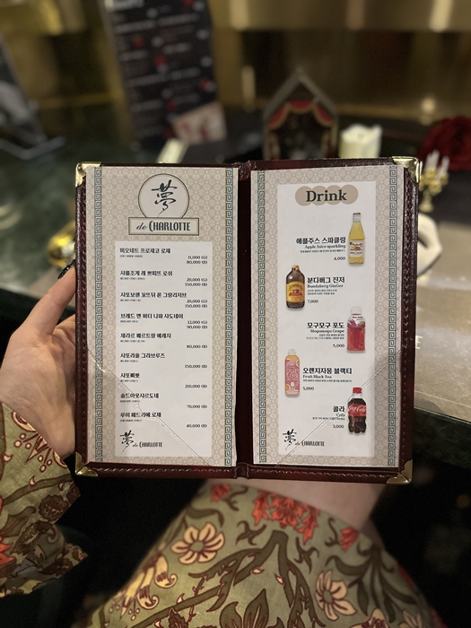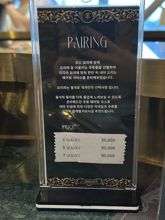몽드 샬롯 입구입니다. 입구부터 오페라의 유령 테마가 물씬 풍겨와서 마음이 설렜습니다. 샤롯데씨어터 몽드샬롯 주차는 당일 공연 관람객에 한하여 4시간에 4,000원인 주차권을 판매하고 있습니다. 차량을 이용하시는 분들은 주차권을 꼭 구매하시길 바랍니다. 개인적인 의견으로는 롯데월드는 항상 주차장이 혼잡하다 보니 대중교통 이용을 추천드립니다. 그리고 아름다운 음식에 와인 페어링은 절대 빠져서는 안 됩니다.