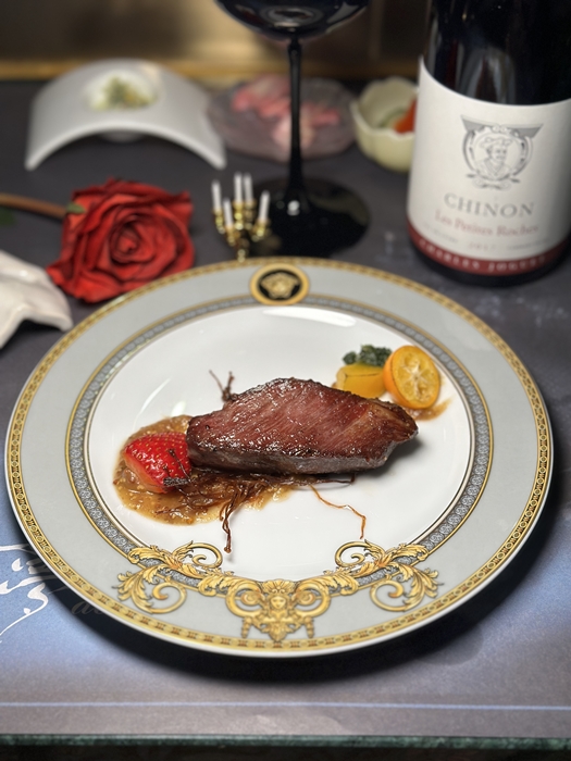 여섯 번째 메뉴는 이베리코 플란차입니다. 바삭하게 구운 이베리코 플란차와 샤를 조게 와인은 정말 좋은 조합이었습니다.