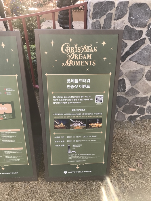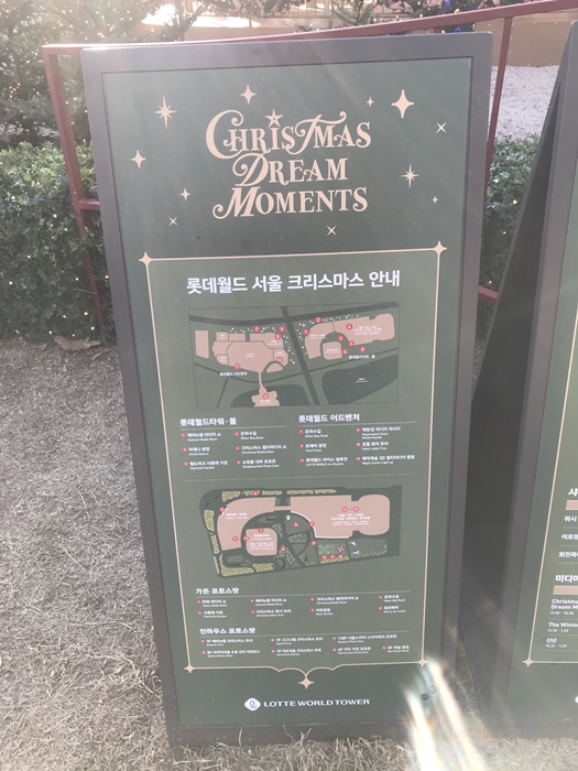 야외에도 롯데월드 서울 크리스마스 안내, 운영 안내, 롯데월드타워 인증숏 이벤트 표지판이 있습니다. 각각 테마와 운영시간과 스토리 같은 인포메이션이 정리가 되어 있습니다. 샤롯데 가든은 괴테의 젊은 베르테르의 슬픔의 주인공인 '샤를 로테를 생각하며 꾸미지 않았을까?' 하고 생각해봤습니다. 회전목마의 스토리는 '화려한 조명의 회전목마를 탄 순간 눈앞에 동심의 세계가 펼쳐집니다.'입니다.