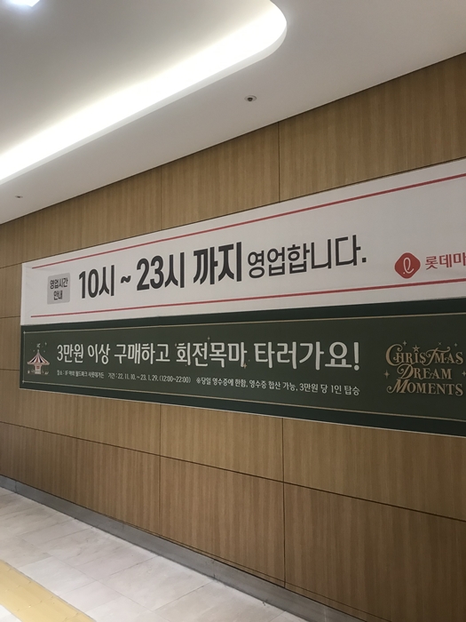 잠실역 공영 주차장에 차량을 주차 후 이어지는 통로를 따라서 롯데월드몰로 걸어서 이동을 하였습니다. 롯데마트의 영업시간은 10시부터 23시이며 '3만 원 이상 구매 시 회전목마를 탈 수 있습니다.' Christmas Dream Moments라는 문구가 인상적이어서 30대 중반에 접어드는 저도 기대가 되었습니다. 회전목마를 타는 장소는 1층 야외 월드파크 샤롯데 가든이며 회전목마 운영 기간은 2022.11.10 ~ 23. 1.29 (12:00~22:00)입니다. 당일 영수증에 한하며 영수증 합산이 가능하고 3만 원당 1인 탑승인 점 참조하시길 바랍니다.