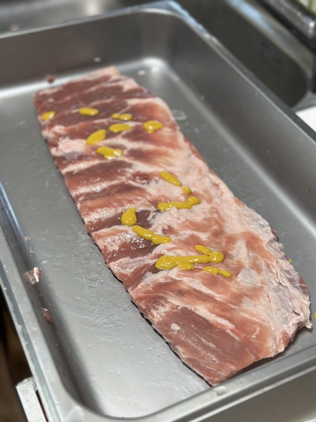 이제 스페어립에 럽을 발라줄 차례입니다. 문츠 바비큐 업장에서는 머스타드를 사용하지 않는다고 합니다. 하지만 저는 스페어립에 럽이 잘발리는게 좋기 때문에 엘로우 머스타드를 적당히 발라주었습니다.