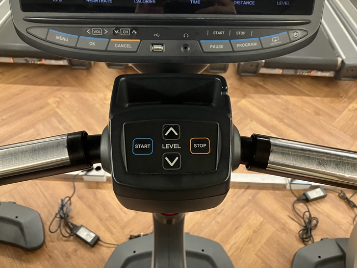 디랙스 사이클 레밸 세팅 시 너무 낮은 레밸을 맞추면 엉덩이가 들썩거리고 너무 높은 레밸을 세팅하면 다리가 버티질 못하고 무산소 운동이 되어버리겠죠? 90 RPM(알피엠)을 유지하면서 10분 정도만 타보면 나에게 맞는 레밸(기어)을 찾을 수 있습니다. 그리고 아래 사진의 손잡이 부분의 은색 부분을 양손으로 잡으면 자동으로 심박수가 측정됩니다.