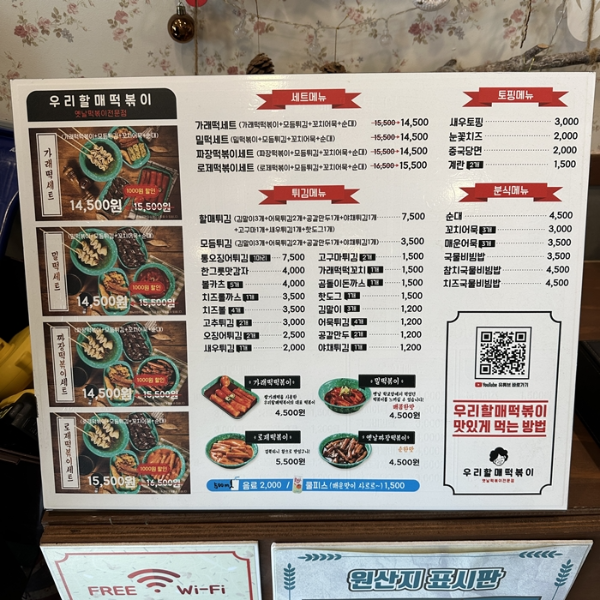 우리 할매 떡볶이 메뉴판입니다. 항상 느끼는 거지만 메뉴가 정말 다양한 점도 좋지만 우리할매 떡볶이의 진짜 매력은 밀떡과 쌀떡을 고를 수 있다는 점입니다. 떡볶이 고수 분들은 잘 아시겠지만 그 날 기분에 따라 밀떡 혹은 쌀떡으로 골라 먹을 수 있는 것은 마치 두 마리 토끼를 다 잡는 것과 같다고 할 수 있습니다.