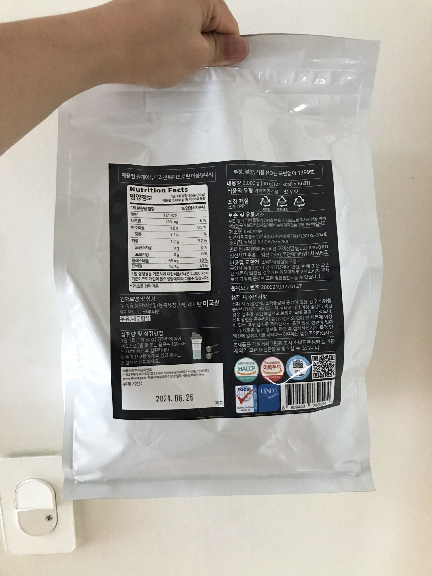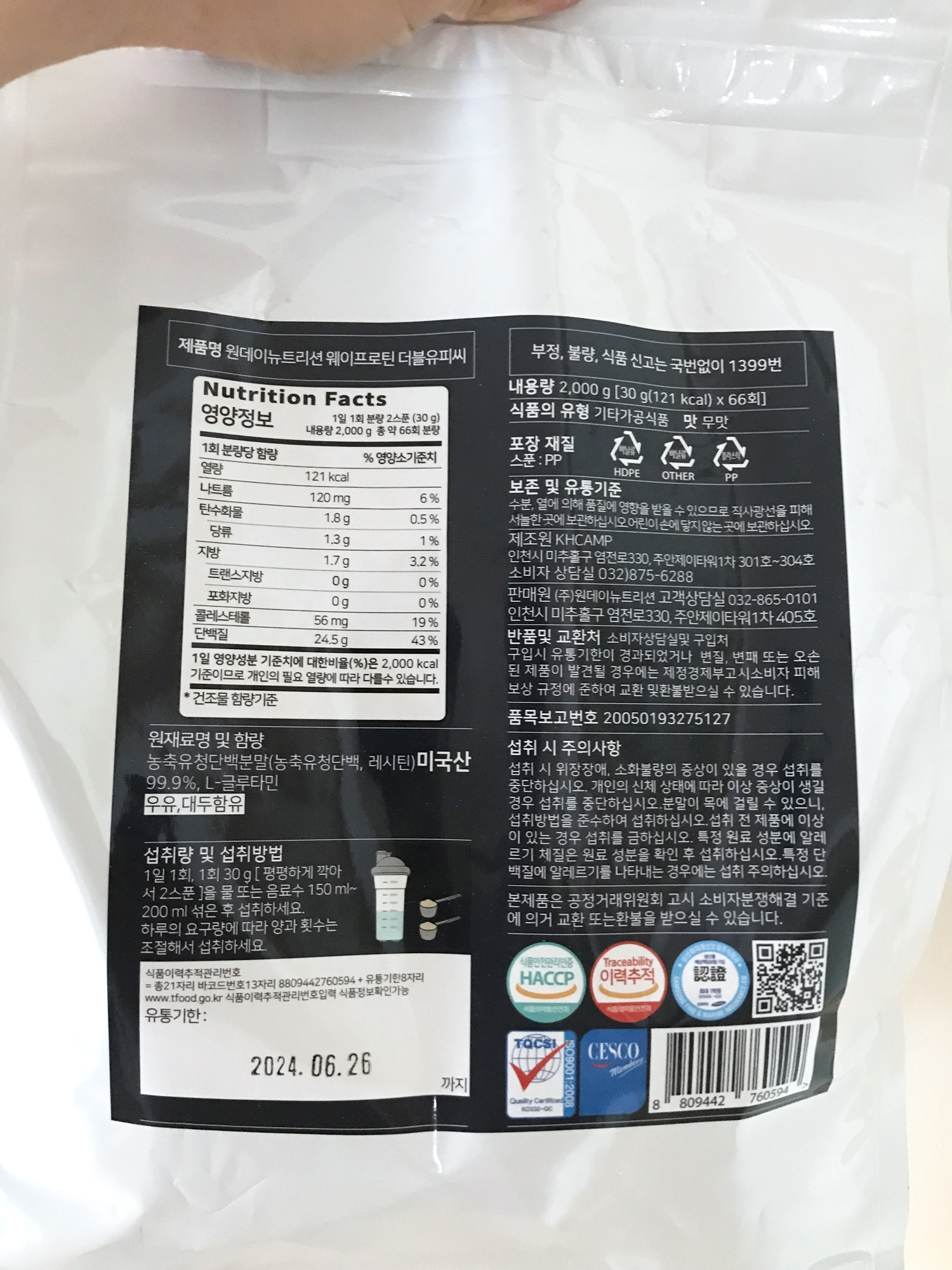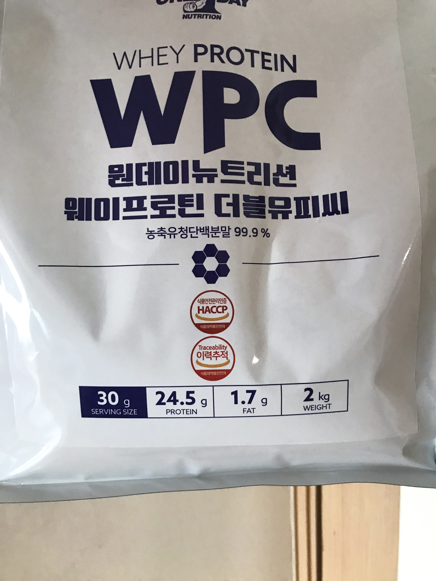 최근에 주문한 가성비 최고 원데이뉴트리션 WPC 농축유청단백질 2kg 포대 유청이다.