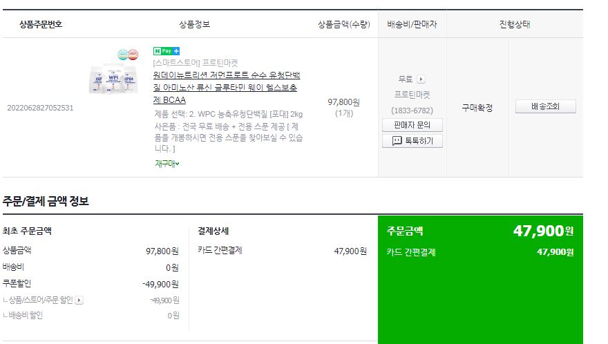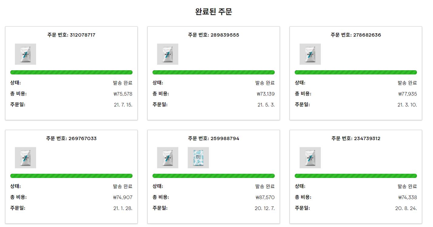 나의 마이 프로틴 단백질 보충제 마지막 주문 내역이다.