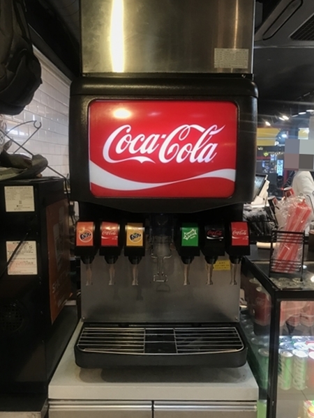 음료를 주문하면 빈 종이컵을 주기 때문에 아래에 보이는 탄산음료 머신에서 취향 껏 따라서 먹을 수 있습니다. 리필이 가능하기 때문에 탄산음료를 좋아하시는 분들에게는 좋은 소식입니다.