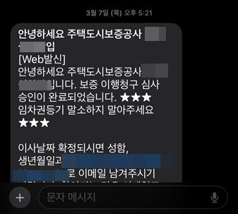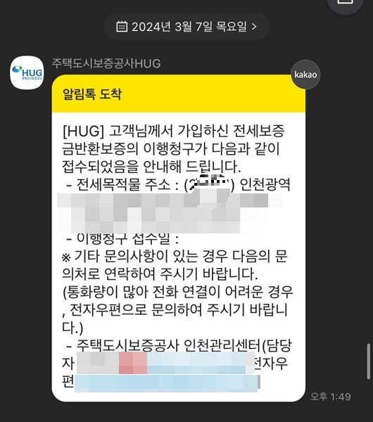 이행청구 접수날로부터 전세보증보험 반환 이행청구 승인까지의 소요기간은 45일입니다. 임차권 등기명령과 이행청구 승인 소요 기간을 합치면 약 3달 정도 소요 되었습니다. 2024년 1월 11일에 주택도시보증공사 인천관리센터에서 이행청구를 접수했고 2024년 3월 7일에 주택도시보증공사 담당자분에게 연락이 왔습니다. 이행청구가 완료되면 위 사진과 같은 카톡과, 문자가 옵니다. 주택도시보증공사 hug에서 이행청구가 접수되었다는 카톡이 먼저 오며 저녁 시간에 담당자분께 보증 이행청구 심사 승인이 완료되었다는 문자를 받았습니다.