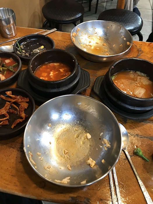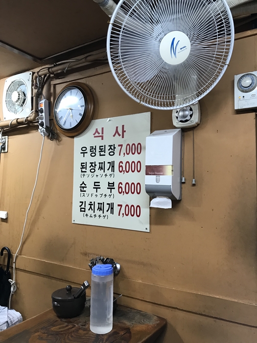 뚝배기집의 메뉴는 믿기 힘들 정도로 저렴합니다. 저희는 순두부찌개 1개와 김치찌개 1개를 주문하였습니다. 저녁 식사 피크 타임 전에 방문하여 몇 안 되는 테이블이 여유가 있었습니다.