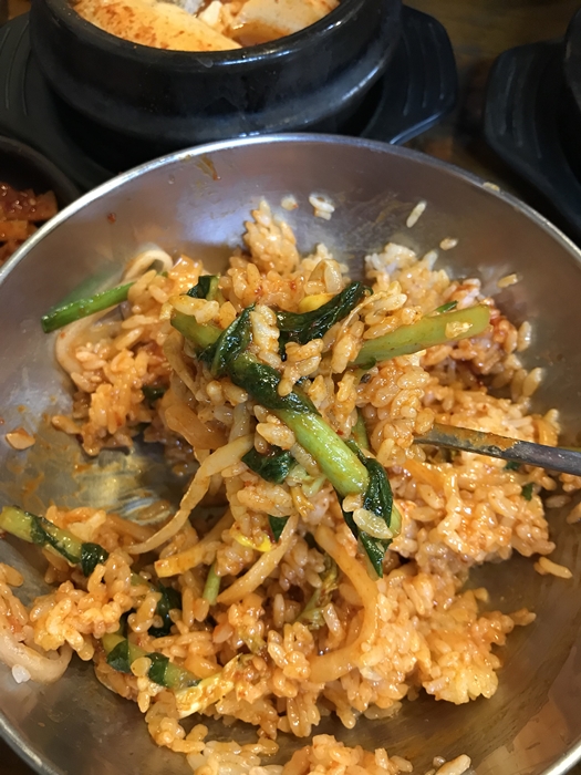 뚝배기집은 기본적으로 무생채와 고추장이 제공됩니다. 참기름이 뿌려진 밥에 밑반찬을 넣고 싶은 것들을 적당히 넣은 다음 무생체와 고추장을 적당히 넣어서 비비면 뚝배기집만의 훌륭한 비빔밥이 완성됩니다. 같이 간 일행의 밥까지 뺏어 먹는 덕에 찌개 국물을 남겨서 조금 아쉬웠습니다. 다음에는 순두부찌개 말고 우렁된장을 한번 먹어 봐야겠다는 생각이 듭니다.