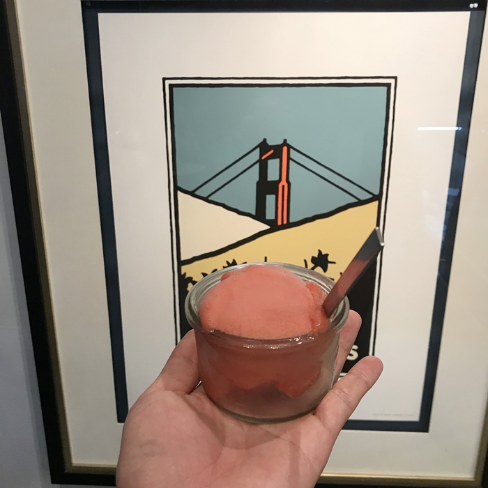 같이 펠앤콜에 방문한 일행들은 오늘의  아이스크림(Today's Menu)에 있는 아오리 머스캣 소르베(Green Apple grape)와 맵 땅콩버터(Spicy Honey Peanut butter)를 주문하였고 저는 볼 빨간 수박 소르베를 주문했습니다. 아직 여름이 떠나지 않았기 때문에 수박 소르베가 먹어 보고 싶었었습니다. 특이하게도 수박 소르베 위에 19금이라는 글자가 적혀 있어서 펠앤콜 대표님께 물어보니 보드카가 조금 들어 있다고 했습니다. 1% 미만이기 때문에 취할 걱정은 안 해도 된다고 하셨습니다. 차량을 가져가지 않아서 그냥 먹었지만 알코올에 민감하신 분들도 있으니 참조하시면 좋을 거 같습니다.