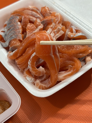 낚은 송어를 즉석에서 회나 구이로 먹을 수 있습니다. 송어를 아무도 먹지 않는 관계로 혼자 먹었습니다. 평창 송어 축제 송어회의 식감은 광어에 가깝고 풍미는 연어에 가까운 생선입니다. 초장과 쌈장에 곁들여서 먹으니 맛이 좋았습니다.